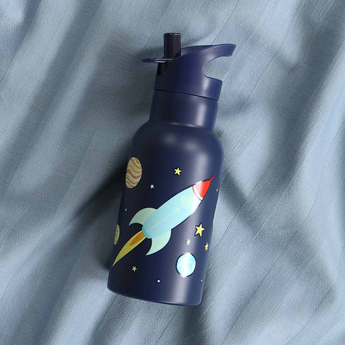 Termiczna butelka dziecięca w kolorze granatowym z motywem rakiety kosmicznej