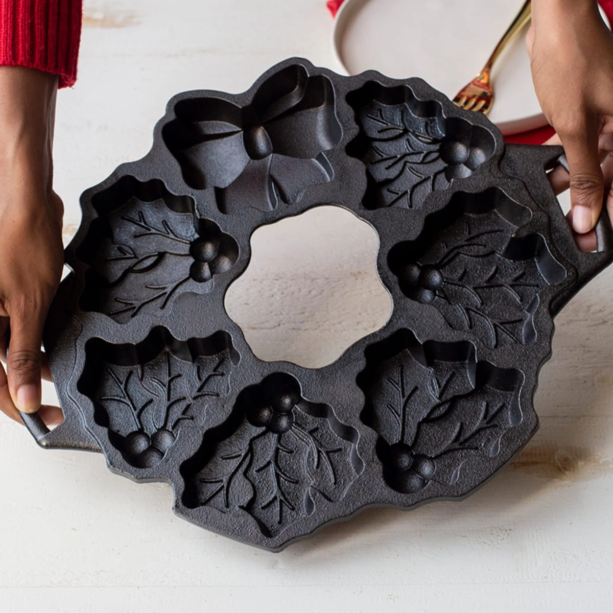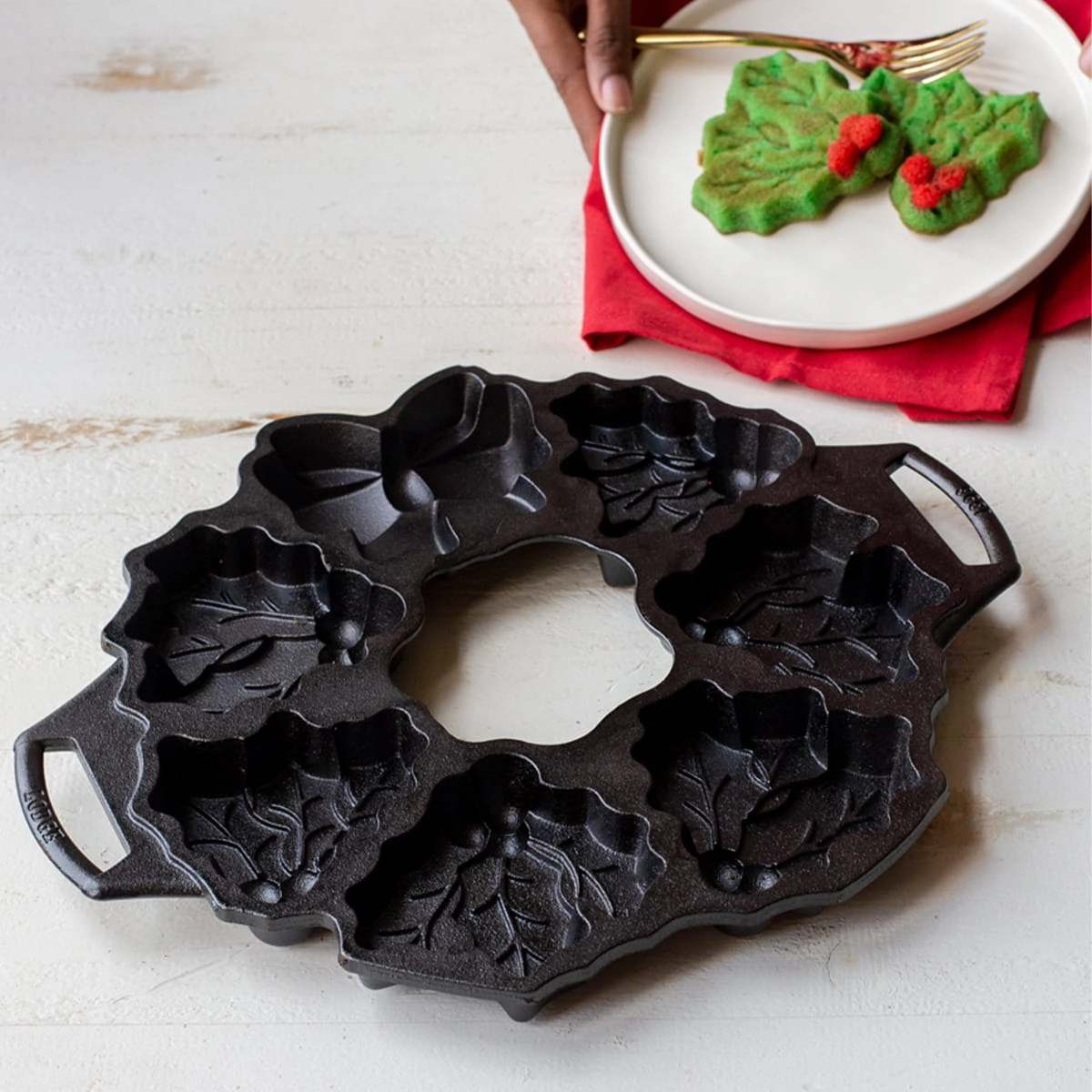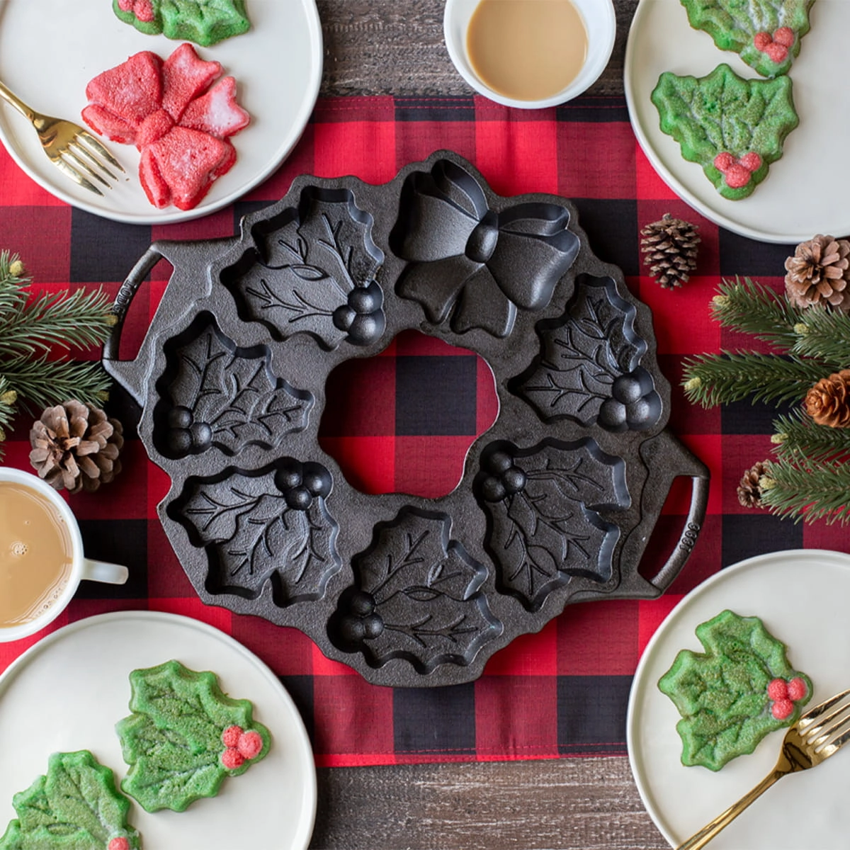 Dzięki żeliwnej formie Lodge upieczesz 7 ciastek w kształcie liści ostrokrzewu z jagodami oraz ozdobną kokardę. Możesz użyć ich do udekorowania stołu, układając w formie świątecznej girlandy.