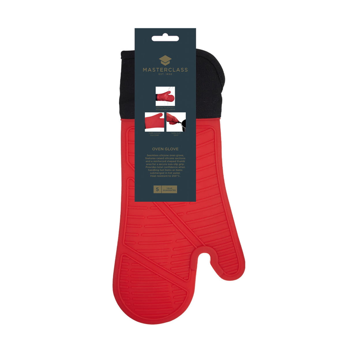 Bezpieczne i pewne chwytanie gorących naczyń dzięki silikonowej rękawicy MasterClass.Odporna na temperatury do 250°C, wodoodporna i z długim mankietem dla dodatkowej ochrony.