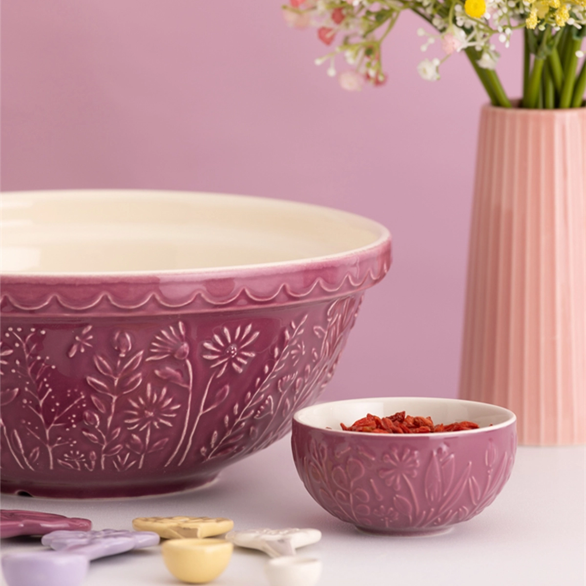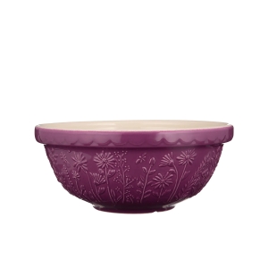 Kuchenna miska ceramiczna Mason Cash z kolekcji In the Meadow w rozmiarze S18 (26 cm) to klasyczna misa do wyrabiania ciasta i mieszania składników, opracowana z intencją wieloletniego, codziennego użytkowania. Zewnętrzne ścianki są tłoczone w motywy florystyczne, charakterystyczne dla tej kolekcji. Wariant kolorystyczny producent określa jako „Daisy Purple Mix”.