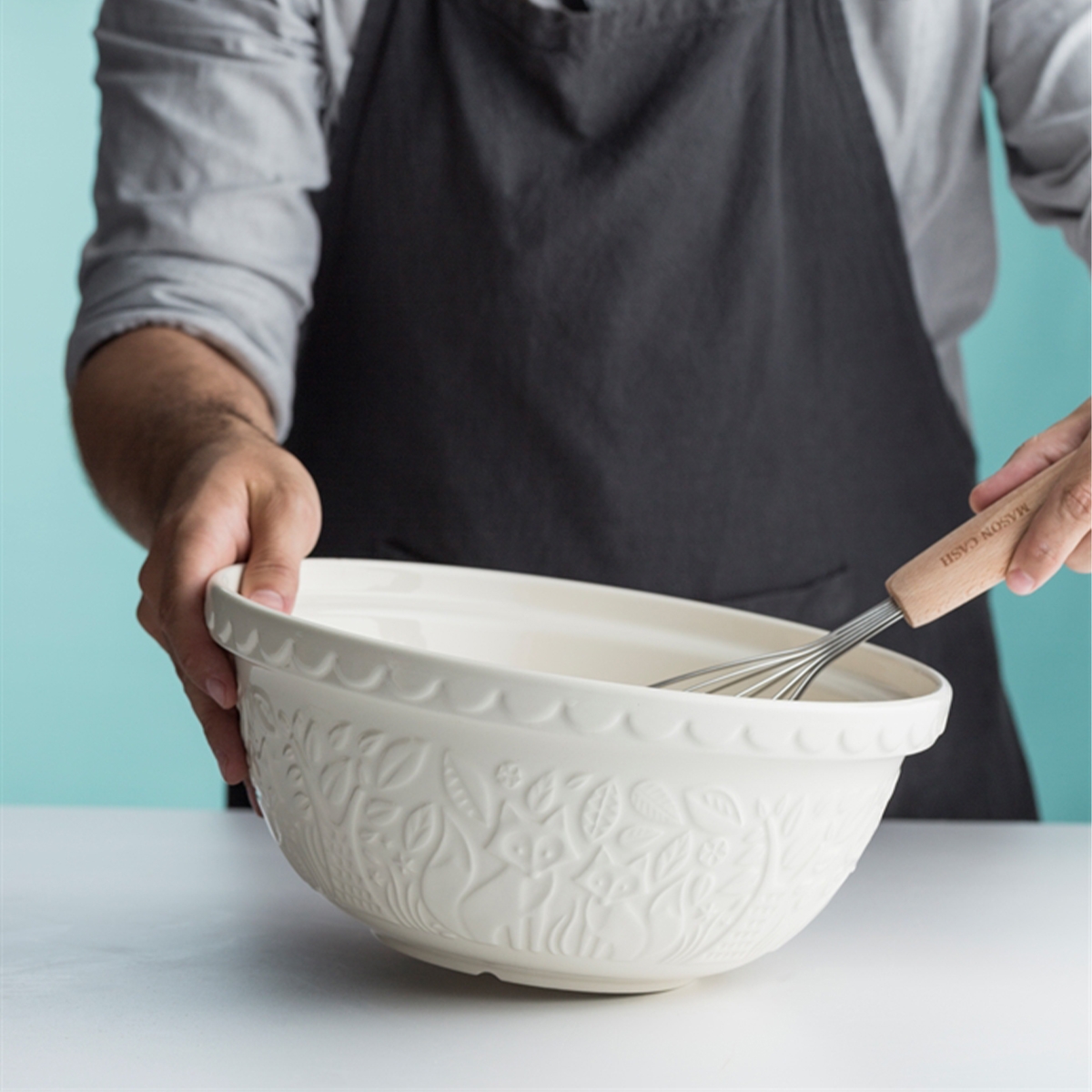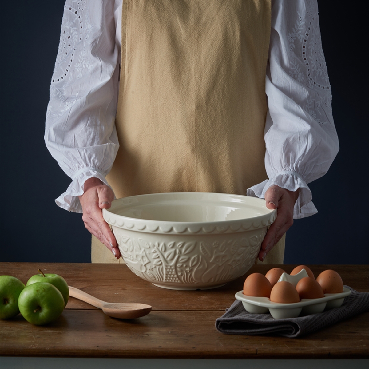 Ceramiczna miska kuchenna Mason Cash z kolekcji In the Forest w rozmiarze S12 (średnica 29 cm) to klasyczna misa do wyrabiania ciasta i mieszania, zaprojektowana z myślą o codziennym pieczeniu. Zewnętrzne ściany misy zdobione są scenami leśnymi inspirowanymi angielskimi opowieściami ludowymi z połowy XIX wieku, co nadaje kolekcji rozpoznawalny charakter.