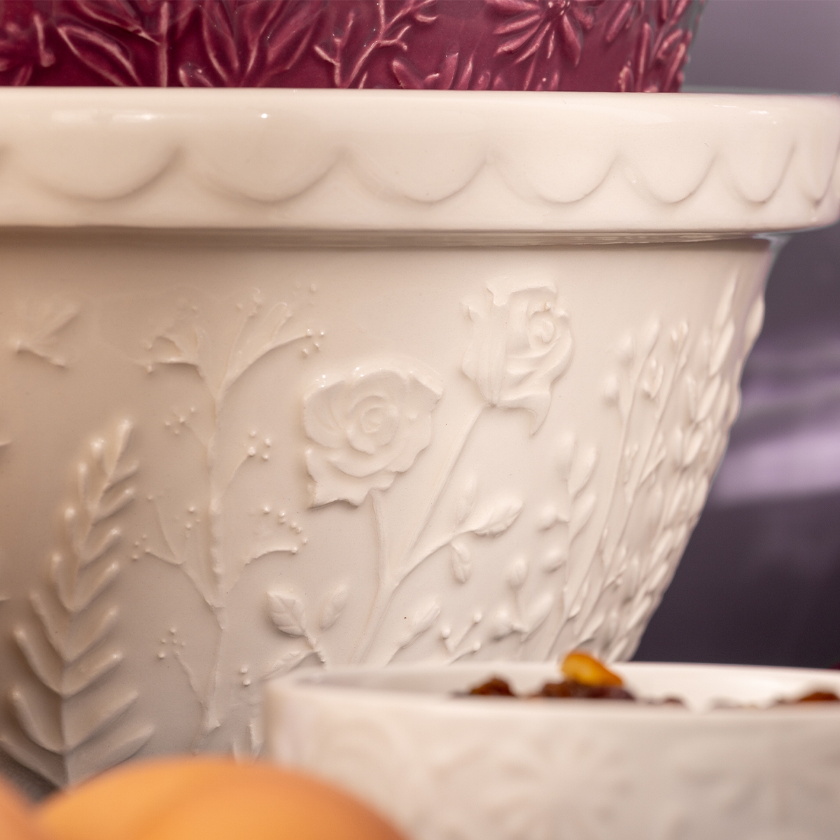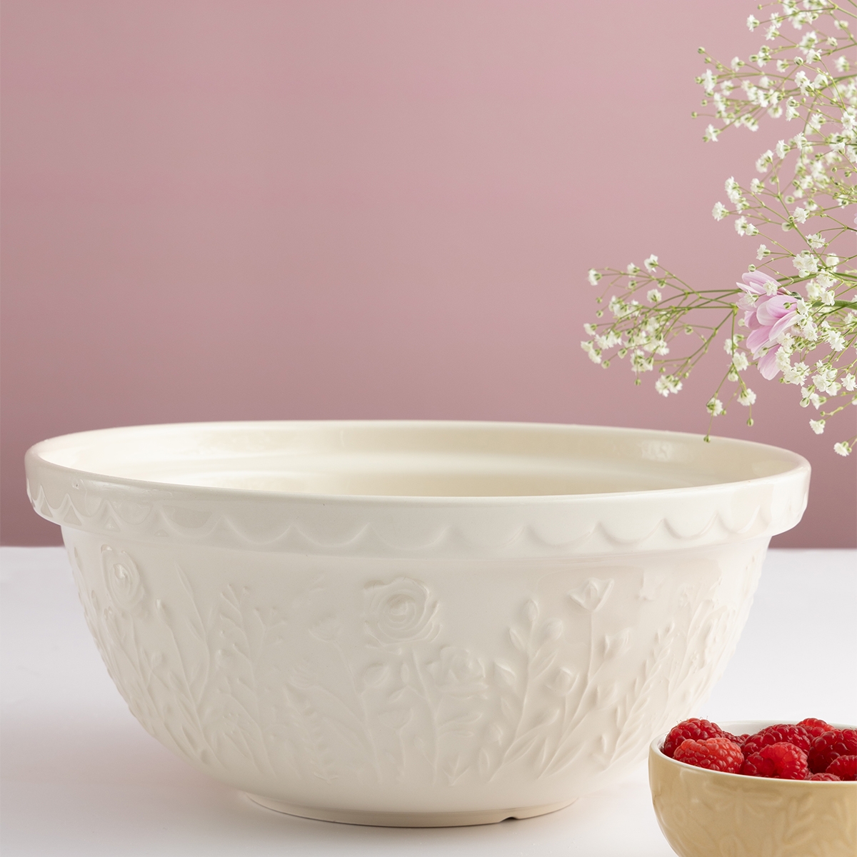 Ceramiczna miska kuchenna Mason Cash z kolekcji In the Meadow w rozmiarze S12 (29 cm) to klasyczna misa do wyrabiania ciasta i mieszania składników, opracowana z intencją wieloletniego, codziennego użytkowania. Misa posiada tłoczony, florystyczny dekor na zewnętrznych ściankach, charakterystyczny dla linii In the Meadow. Kolor ceramiki producent określa jako „Cream Rose”.